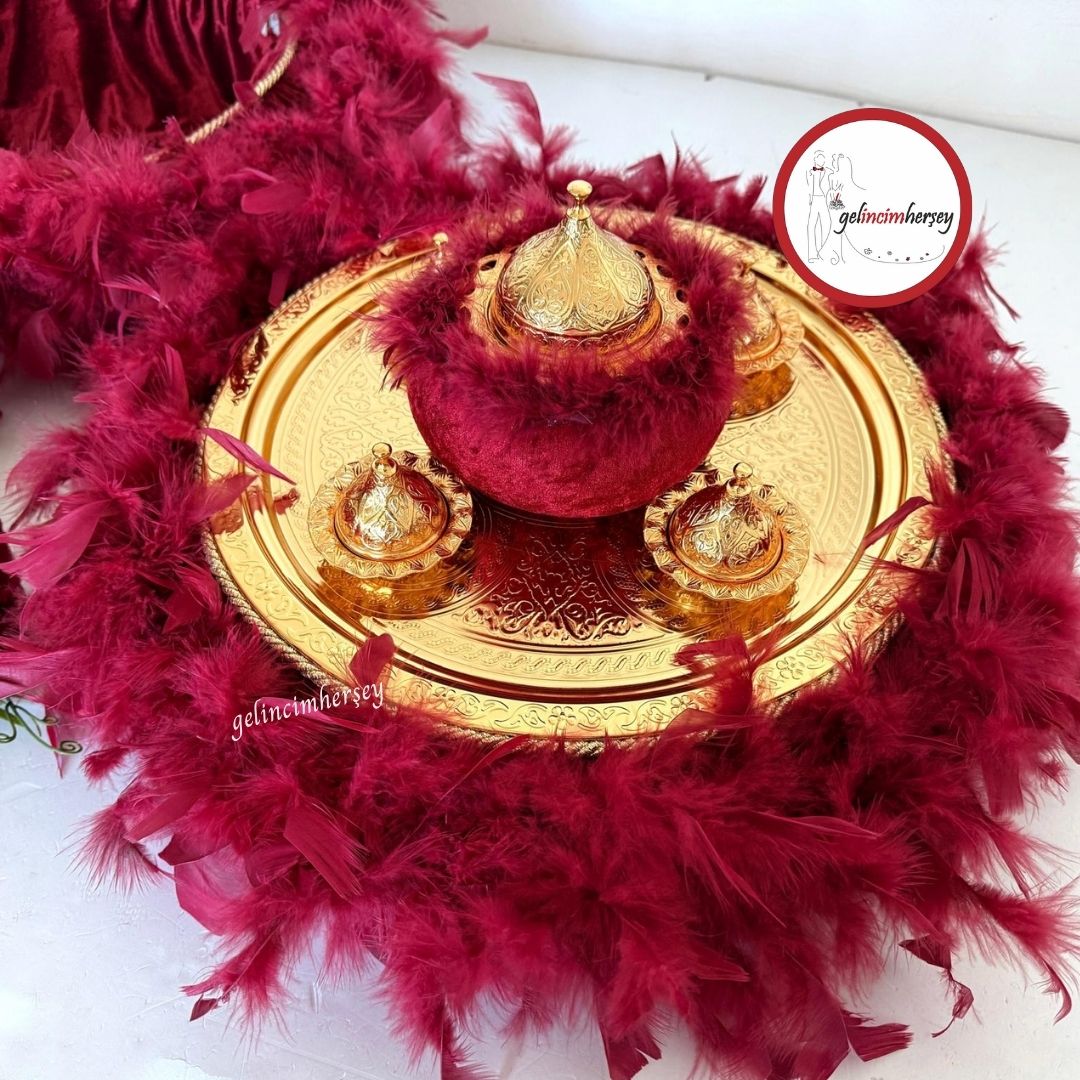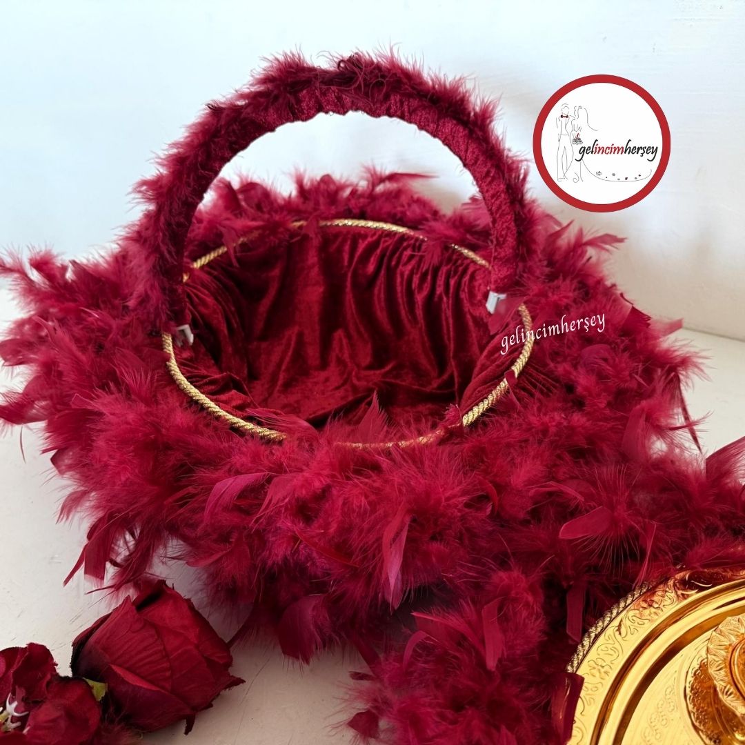 Gelincimherşey Tüylü Kadife Kaplama Metal Tepsili Kına Sepeti ve Kına Tepsisi