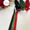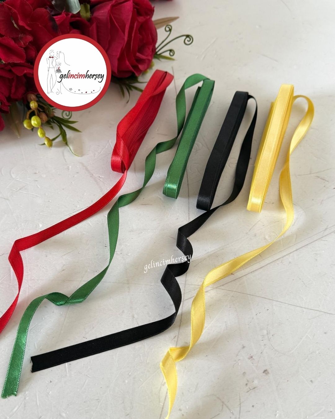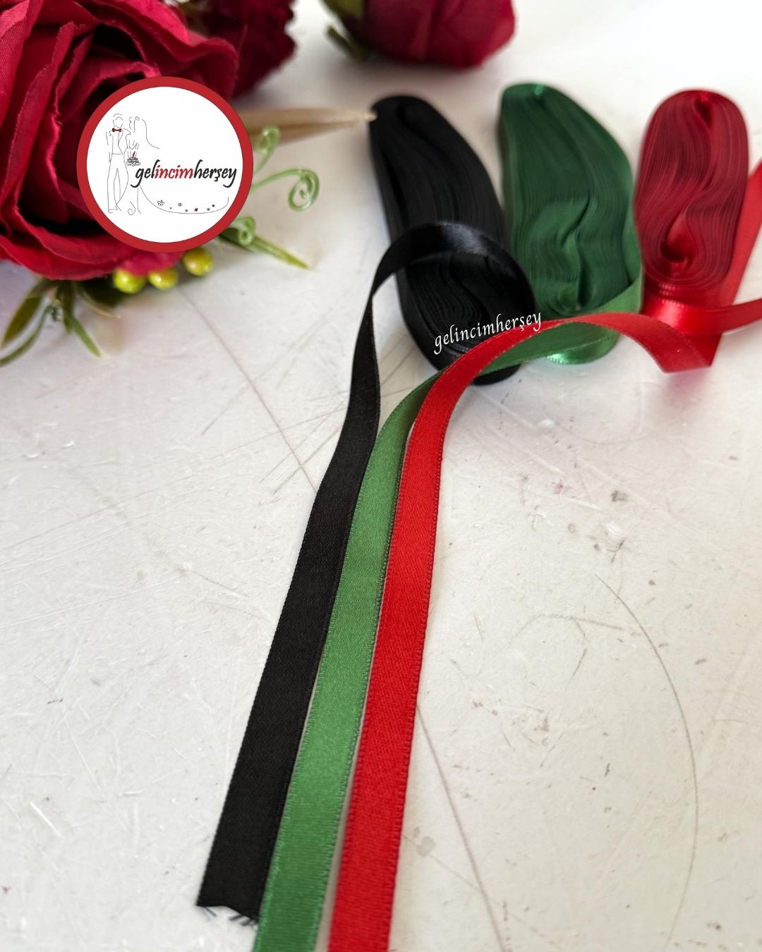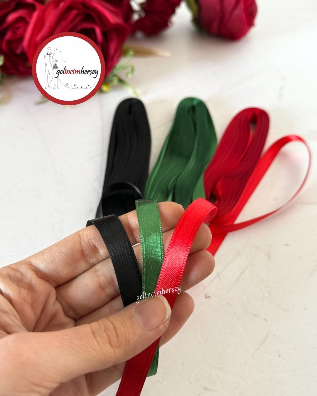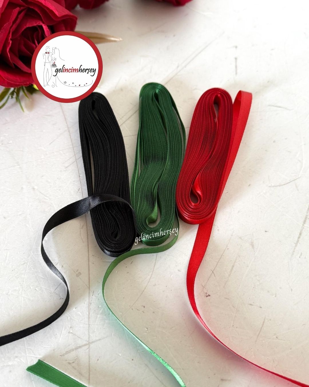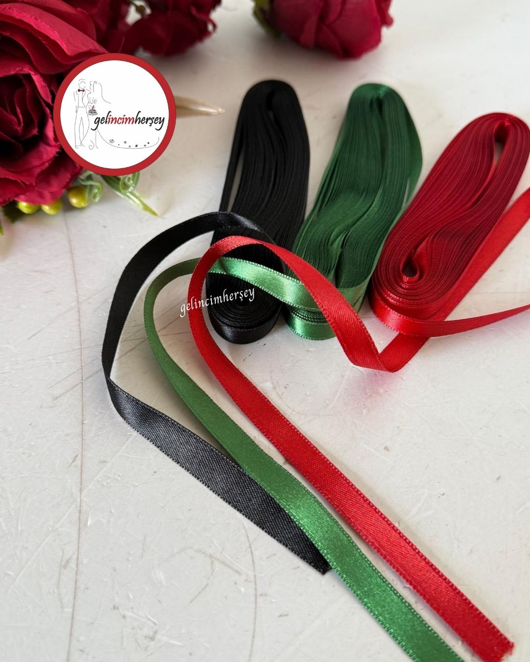 Kırmızı, yeşil ve siyah 3 renk yılbaşı konsept saten kurdele seti. Her biri 1 cm genişliğinde ve 10 metre uzunluğunda parlak saten kurdele.