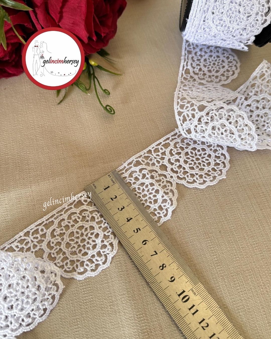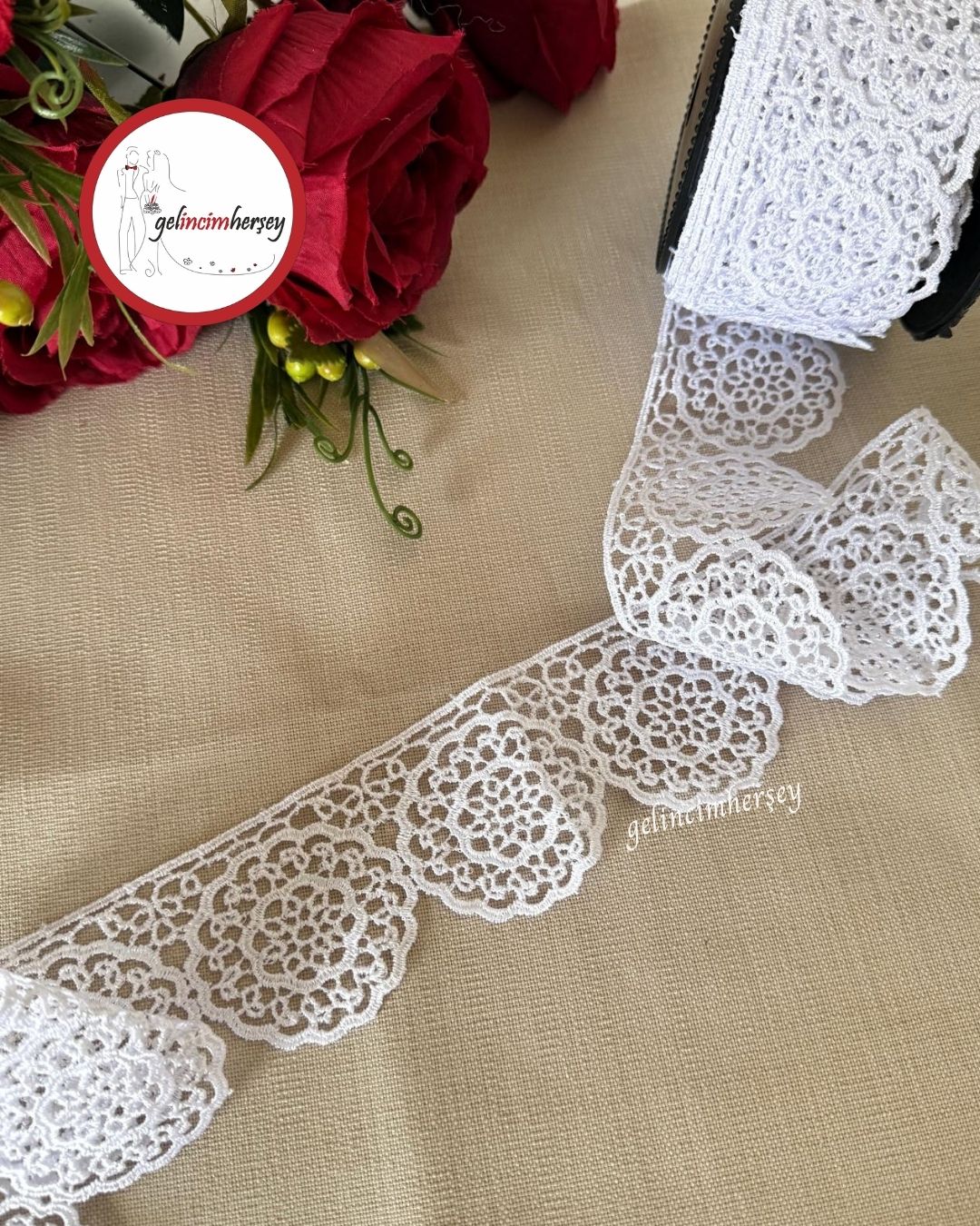 Gelincimherşey Yuvarlak Beyaz Dantel Güpür 5.5 cm eninde ve 4.5 metre uzunluğundadır. Perde, nevresim, çeyiz ve dekoratif süslemelerde kullanılabilen zarif yuvarlak motifli dantel güpür modelidir.